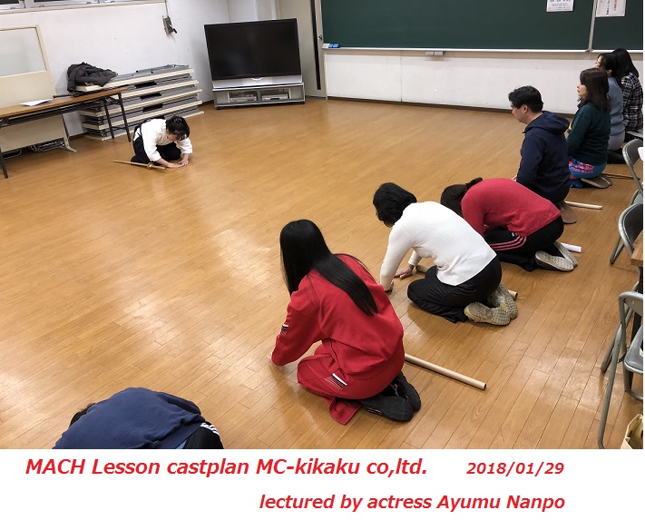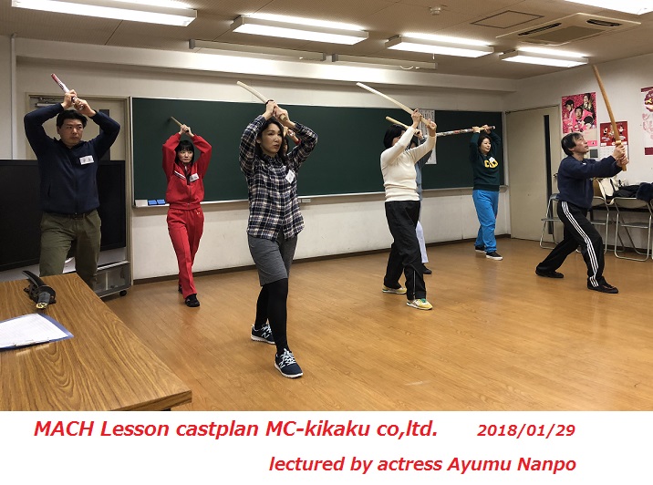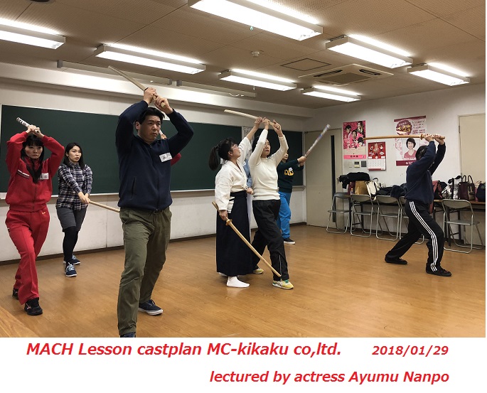 平成30年1月29日(月) 今回はいつもお伝えしています「ビギナーズクラス」ではなく、「アドバンスクラス」のレッスンをリポートします。アドバンスクラスはビギナーズを修了された方々で構成していますので、在籍年数も様々です。2年目の方もいらっしゃれば、10年以上の方も混じって、毎週月曜日の夜、演技中心の講義で切磋琢磨されています。 今回は初の試み「剣術・殺陣(たて)」をご指導いただきました。 講師はMC企画の女傑・南保 歩(なんぽあゆむ)さん。著名な剣友会で鍛錬をされてこられた南保先生の指導は、ズバリ「礼に始まり礼に終わる」。皆さんも慣れない木刀さばきに四苦八苦されていました。 昔剣道をすこ~しだけかじったマネージャーHも摺り足に難儀しました<笑>