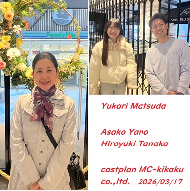 令和8年3月17日(火)<写真左から時計回りに…松田ゆかりさん、矢野朝子さん・田中ひろゆきさん> 某CM撮影にオーディションで役を射止めた松田さん、お客様役でお2人がお越しくださいました。