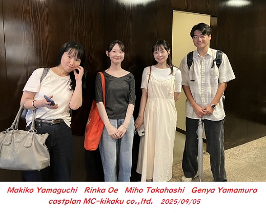 令和7年9月5日(木) <写真左から…山口真生子さん・大江凜花さん・高橋実穂さん・山村弦也さん> 某映画の撮影にご参加いただきました。山村弦也さんは初めての映画経験。どんどん引き出しを増やしていってください!