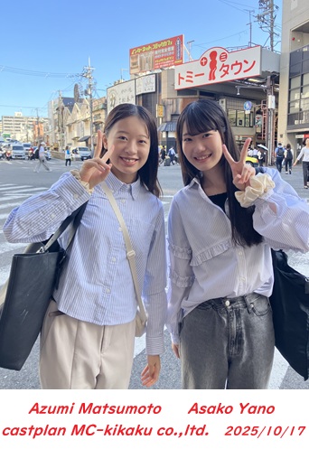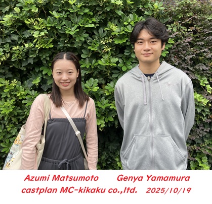 令和7年10月19日(日)<写真左から…松本あずみさん・山村弦也さん> 某CM撮影で、松本さん連チャン登板です。皆さん大学生後半ということで、就活や論文、試験勉強に忙しい中、ご参加くださいました